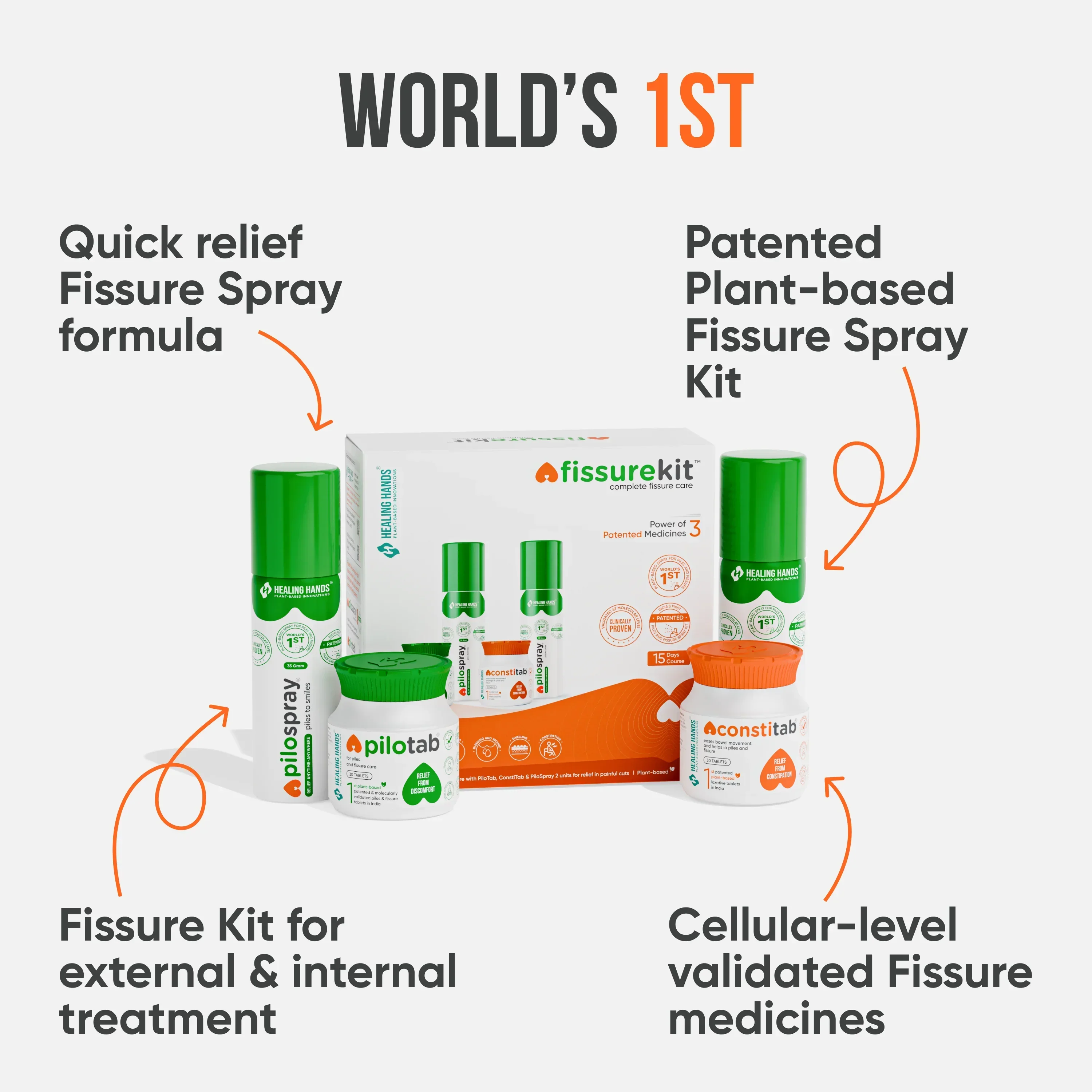 India's 1st patented complete fissure treatment kit, Healing Hands FissureKit, for rapid Fissure pain relief and helps in 3X faster healing. FissureKit comprises patented plant-based medicines PiloSpray 2 units and tablets PiloTab and ConsteTab.